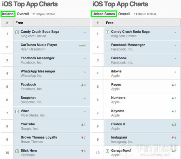 在上述的例子中,美國最受歡迎的10款iOS應用均被大型開(kāi)發(fā)者壟斷,而在愛(ài)爾蘭,排在第2和第10的開(kāi)發(fā)者的規模都相對較小,而第9位的更是一家本地公司。