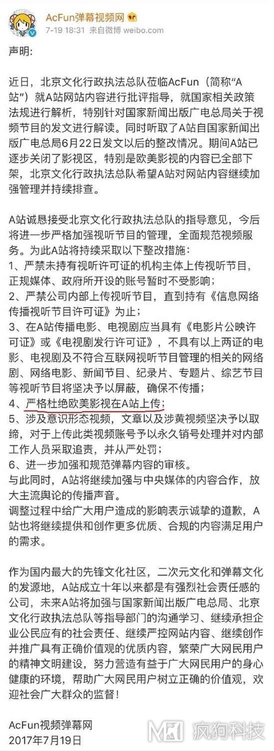AcFun在聲明中透露了站內影視劇資源下架原因,并且公布了一系列整改措施,同時(shí)強調嚴格杜絕歐美影視在A(yíng)站上傳。