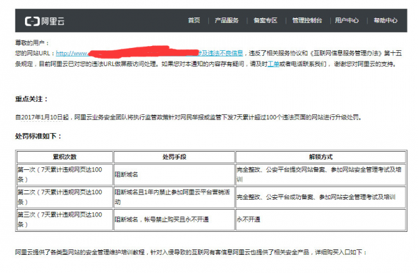 您的網(wǎng)站URL:http://www.********.com/weigui.html涉及違法不良信息,違反了相關(guān)服務(wù)協(xié)議和《互聯(lián)網(wǎng)信息服務(wù)管理辦法》第十五條規定,目前阿里云已對您的違法URL做屏蔽訪(fǎng)問(wèn)處理。如果您對本通知的內容存有疑問(wèn),請及時(shí)工單或者電話(huà)聯(lián)系我們, 謝謝您對阿里云的支持。
